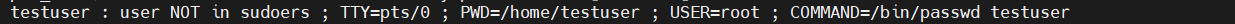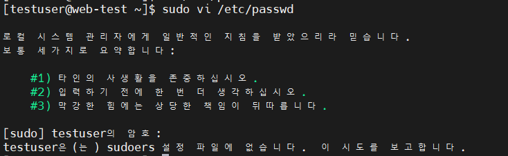 ๊ทธ๋ฆฌ๊ณ root ๋น๋ฐ๋ฒํธ๋ฅผ ์๊ตฌํ์ง ์๊ณ ํ์ฌ ๋ก๊ทธ์ธํ ์ฌ์ฉ์ ๋ณธ์ธ์ ๋น๋ฐ๋ฒํธ๋ฅผ ์ฌ์ฉํด์ sudo ๊ถํ์ ๊ฐ์ง ์ฌ์ฉ์์ธ์ง ๊ฒ์ฆํ๋ค. ๋ง์ฝ sudo ๊ถํ์ ๊ฐ์ง์ง ์์ ์ฌ์ฉ์๋ผ๋ฉด ์์ ๊ฐ์ ์ถ๋ ฅ์ด ๋จ๊ณ , ๋ช ๋ น์ด ์คํ์ด ์๋๋ค.